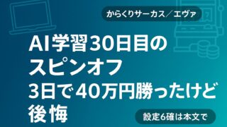 AI学習30日目のスピンオフ。7のつく日にからくりサーカス設定6で万枚、翌日はエヴァ未来への咆哮で4.1万発、3日で40万円勝ち。それでも「時間投資」の観点で後悔した理由と、学習に集中する決断を語ります。AI学習 体験談