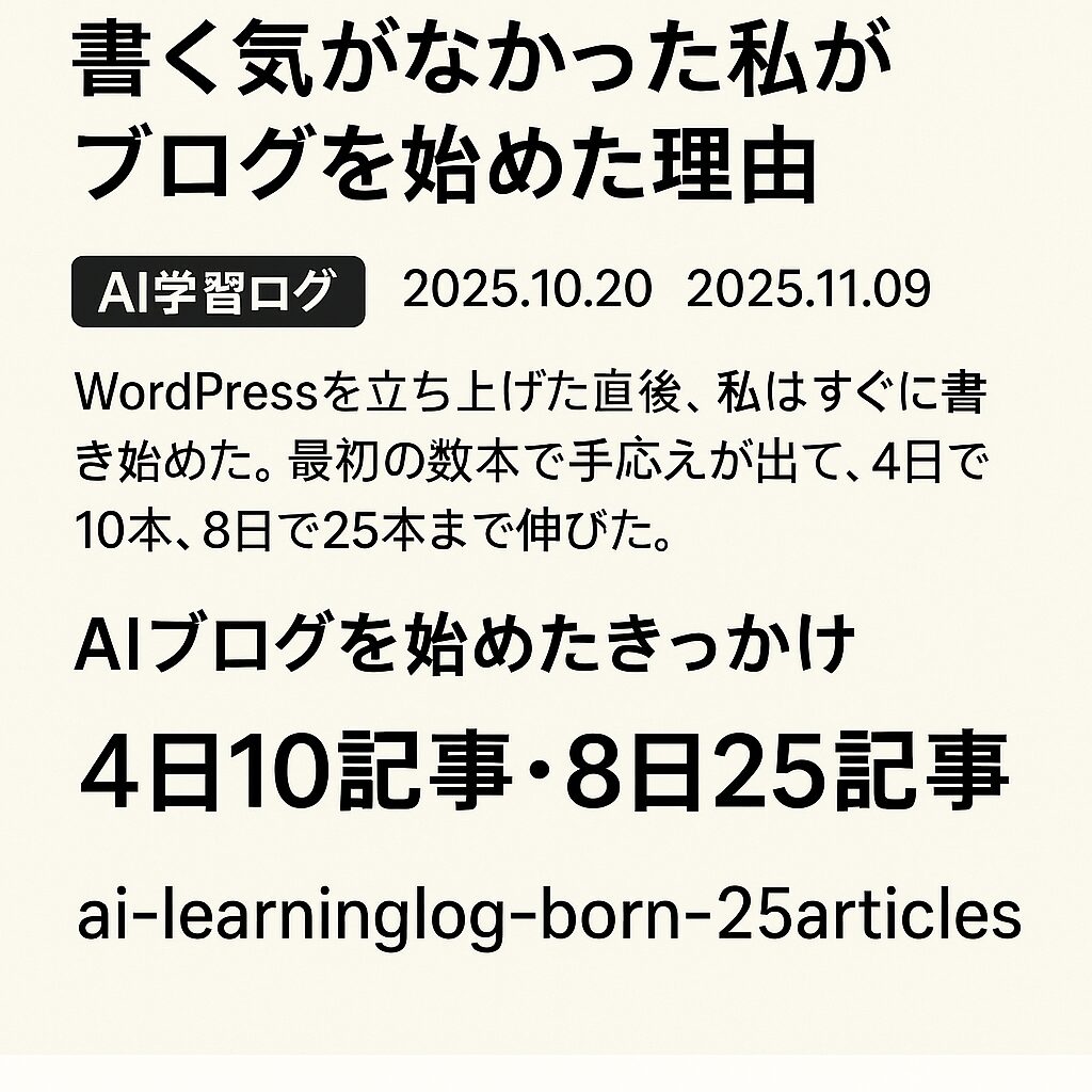 WordPressを立ち上げた直後、私はすぐに書き始めた。最初の数本で手応えが出て、4日で10本、8日で25本まで伸びた。題材は迷ったが、AIが「学習の途中経過こそ価値」と示し、私の記録が記事へ変わっていった。