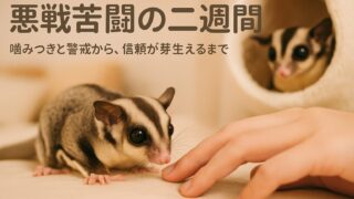 フクロモモンガのエルが警戒を解くまでの二週間。逃げる姿、包む手、眠る瞬間——臆病さの裏にある信頼の芽を描く体験記です。